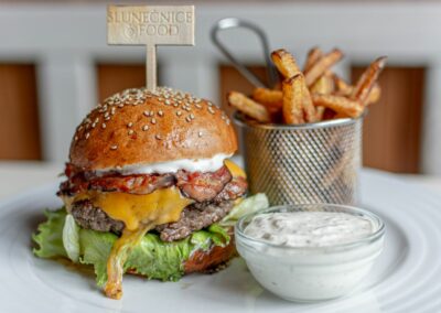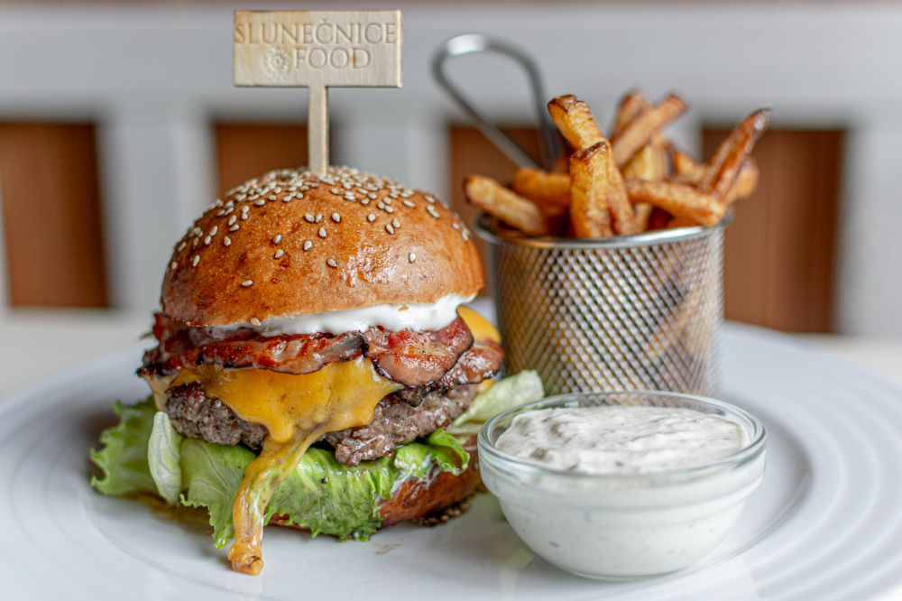 Hovězí burger z vyzrálého masa (zelenina, slanina, chedar, majonéza), naše hranolky